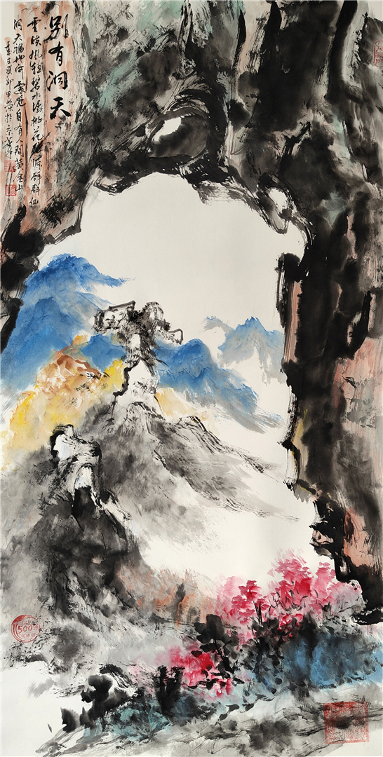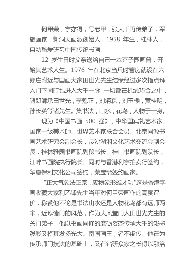 “正大气象法正宗,应物象形雄才功"这是香港字画收藏大家利乙锋先生当年对何甲荣画作的高度评价,称赞他不论是书法山水还是人物花鸟都有远师两宋,近琢诸门的风范,作为大风堂门人田世光先生的关门弟子,他以书画同修的磨砺姿态传承大千的泼墨泼彩又将其发扬光大。南国画王,名不虚传。他在为传承师门技法的基础上,又在钻研众家之长得以融洽自已的思想感情形成自已独特风格,何先生画题非常博涉广泛,能写善画,德艺双馨,而最难能可贵的是他喜欢画名山胜景,特别对那里的洞天景观情有独钟,所以他每到一处对当地洞天景观必看不可,并对景写生,为创新积累大量素材,因此也被同行调侃说成见洞就钻的大画家,可见他十年如一日,终于创作出了独树一帜的洞天观景,所以此画一经展出,便轰动一时,被抢购一空,难怪有人说"错失大千,亦得老甲"这是对何先生的赞誉,而亦得,老甲均为先生的字号,这样的赞誉无疑是对先生的赏识和认可。老甲先生能在大风堂画派的基础上画出富有特色洞天观景,著名艺术评论家陈传习先生特别中肯的评价说:“别洞观景,另有天地,何老甲他就是新洞天画派创始人”故宫博物院:张之铸先生曾说,好的作品自己会说话,就是因为具备了三上条件;既一上墙,拿的出手,挂的出来。二上市,经得起市场的考验,三上书,经的起学术艺术的推敲。“何先生常说艺无止境,别人十年礳一剑”,可他则是几十年礳一剑。